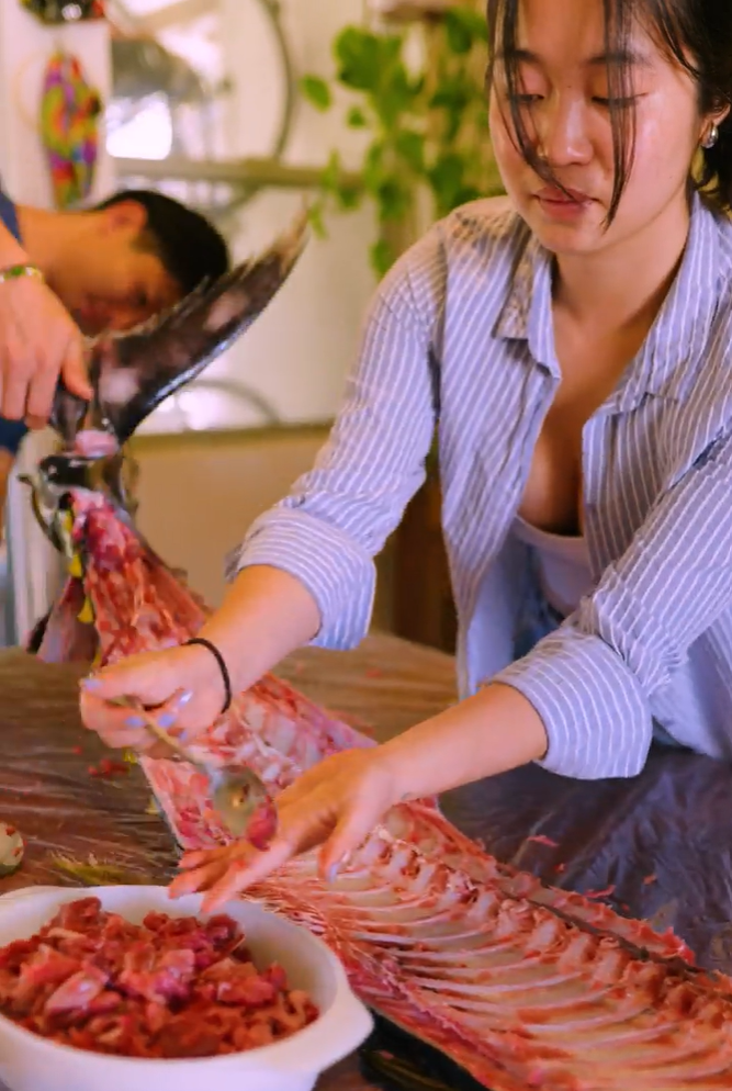 Scraping every bit of valuable meat from the bones of a local Pacific Bluefin Tuna, purchased from Chula Seafood. They allowed us to pick up just the head and bones! Exactly what we wanted for the experience of “spoon meat.” Notice the spoon - use of this tool gives the process its name. Photo by Jake Stein.