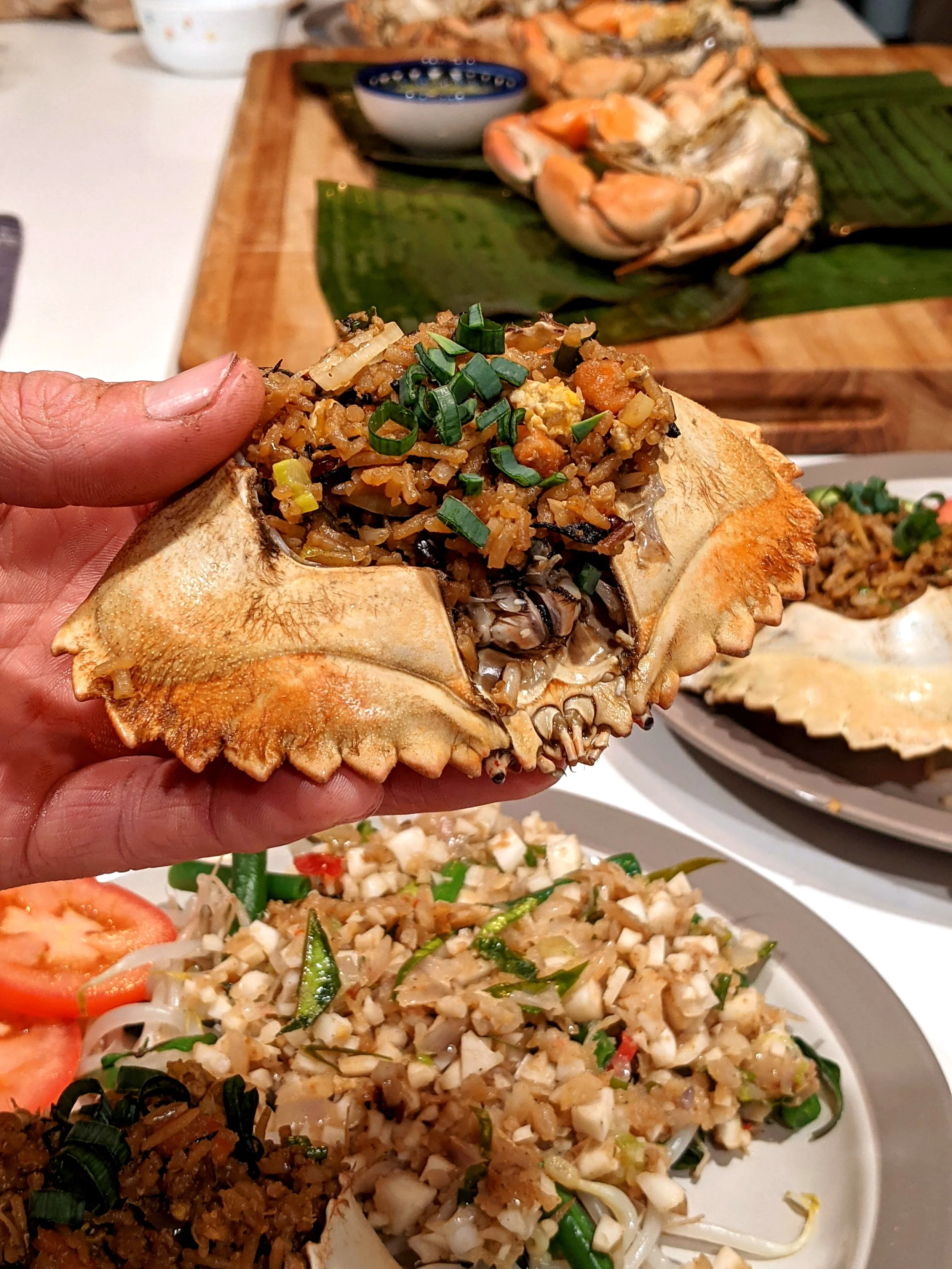 Mix egg, crab butter, and roe thoroughly to scramble. When egg is cooked, add chilled rice. Toss to fry, and season with fish sauce and kecap manis. Taste and adjust seasoning levels to your preference. Cook while mixing continuously for 2-3 minutes. In the last minute, mix in the picked crab meat and minced scallions before removing from heat.