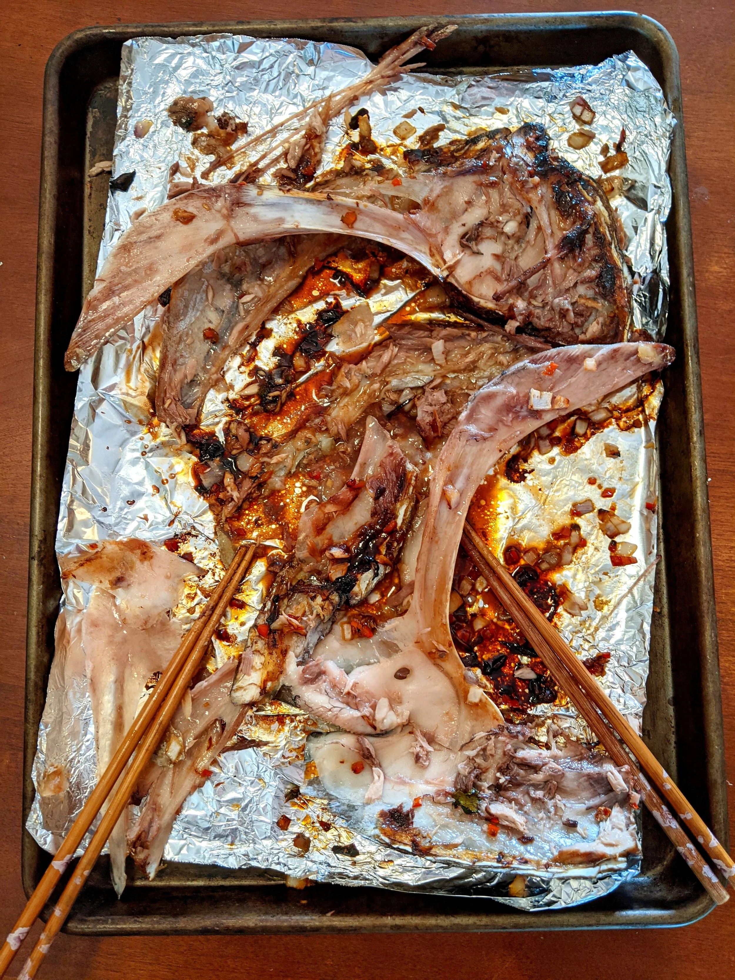 6. Expect small collars (palm or hand-sized) to be finished in around 15 minutes. Check doneness near the 10-minute mark by deeply inserting a chopstick or fork, or tugging on a fin - meat should easily separate from bone. Larger collars will take 30 minutes to an hour, and can be checked in the same way.