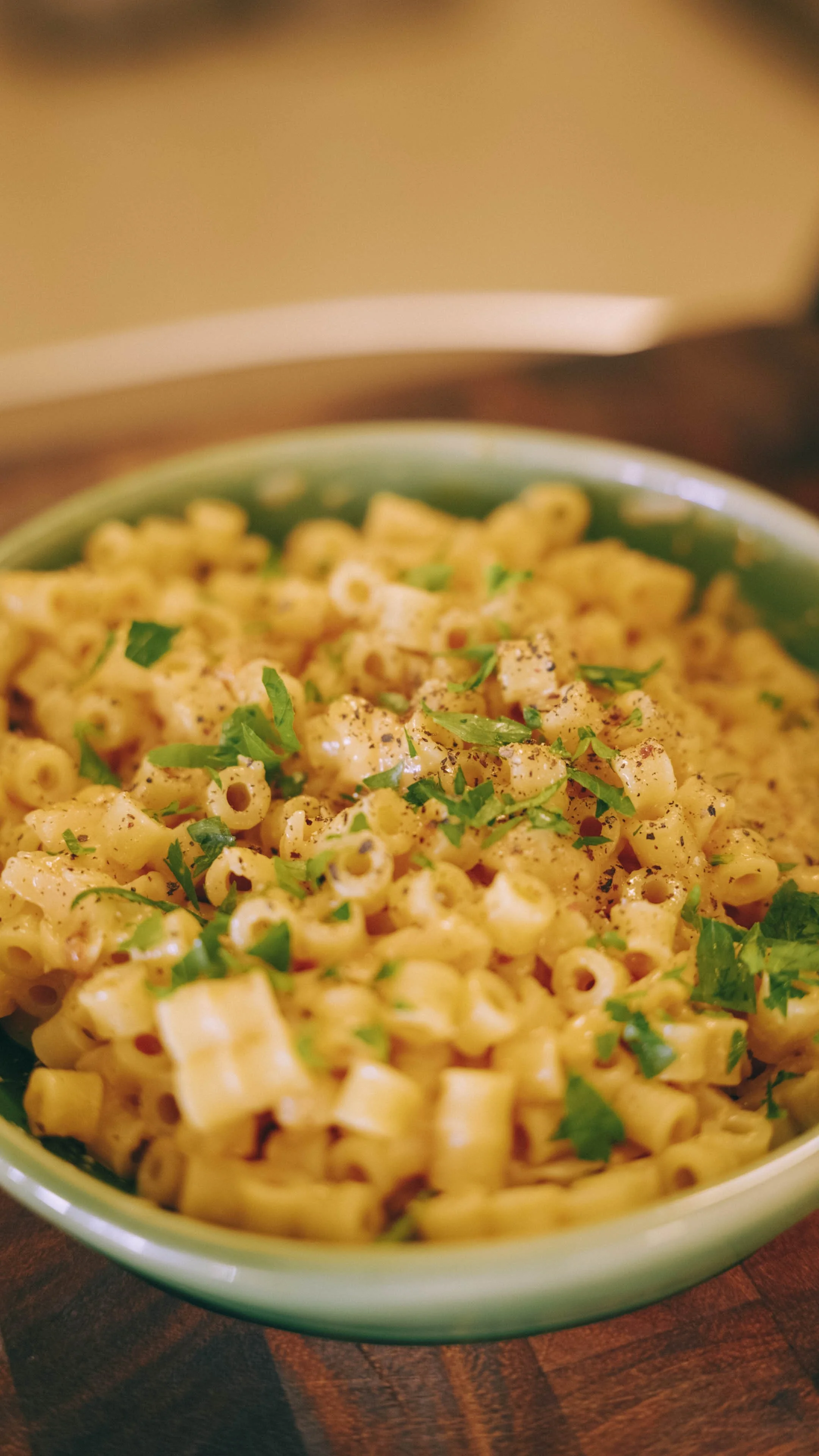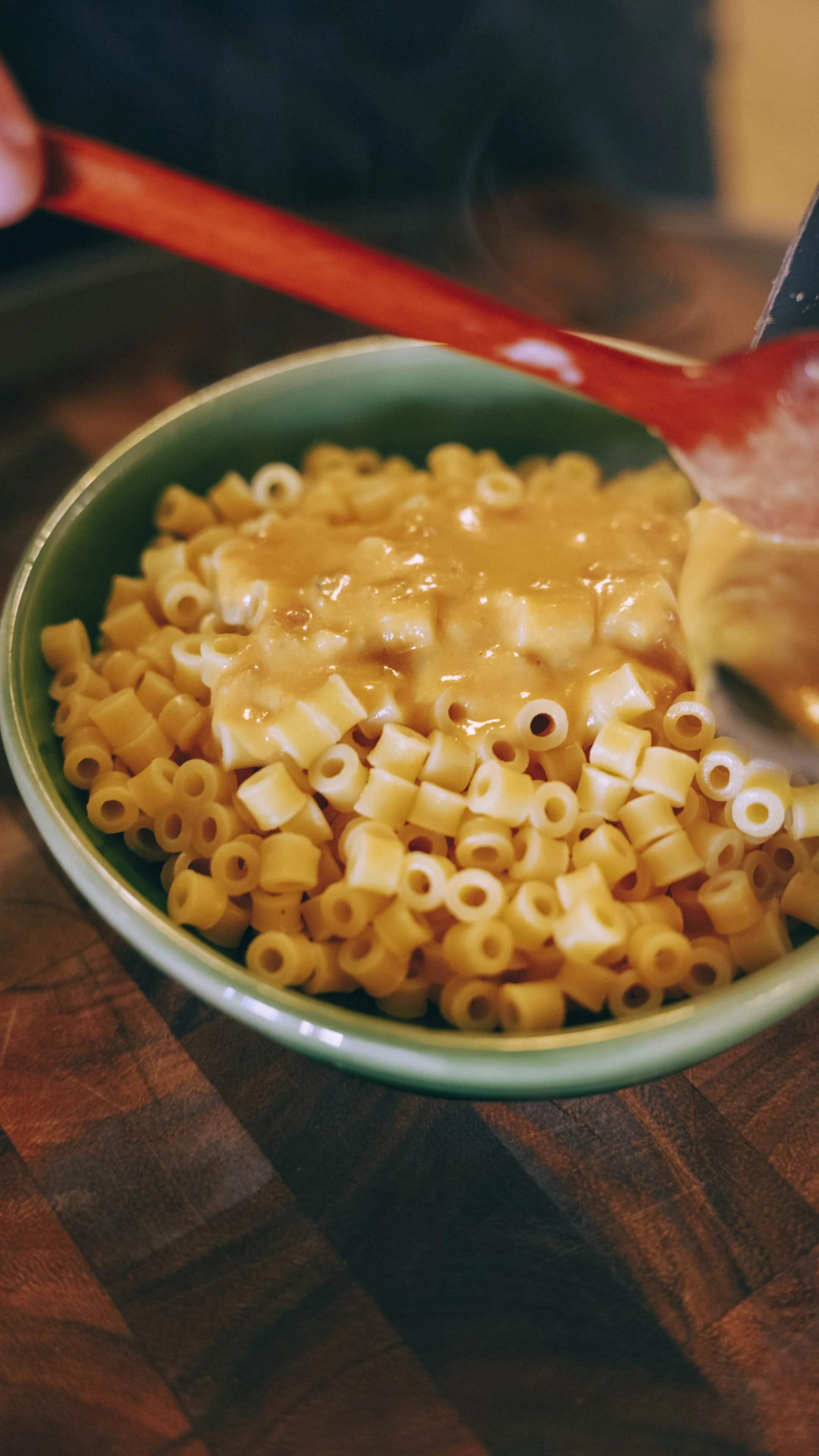 Once fully blended and incorporated, pour sauce over cooked pasta noodles! Stir to combine, then plate and top with garnishes of choice.