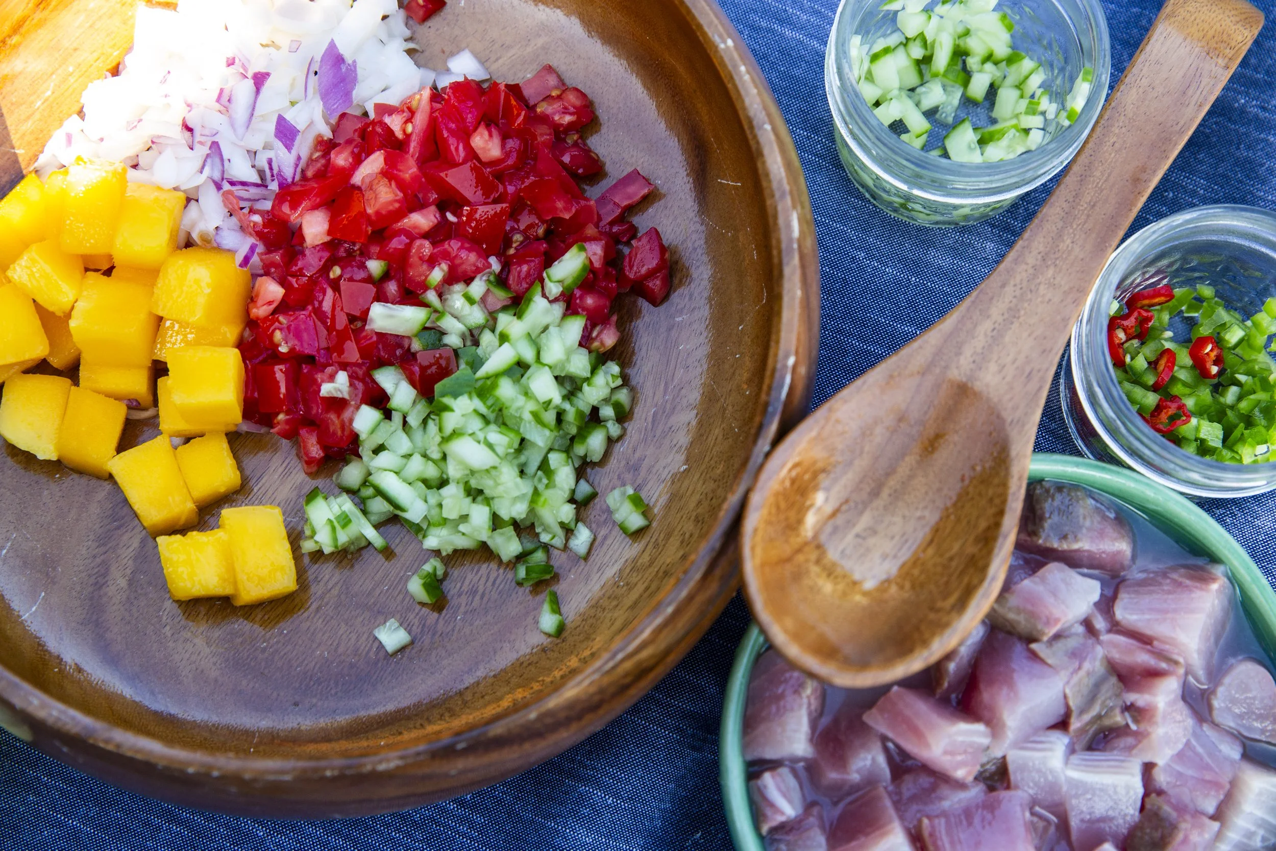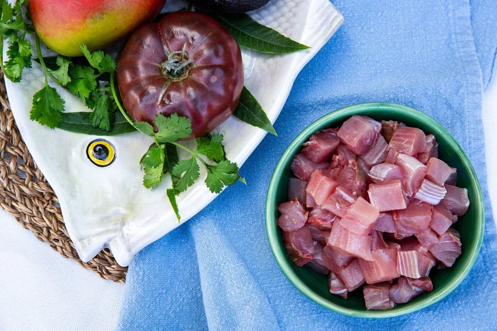 A harmonious and colorful medley of ingredients are tossed together in this recipe synonymous with summer in San Diego. California Yellowtail is more readily available during warm-water months off the Southern California coastline, making it a natural choice for this cooling and refreshing no-cook preparation.